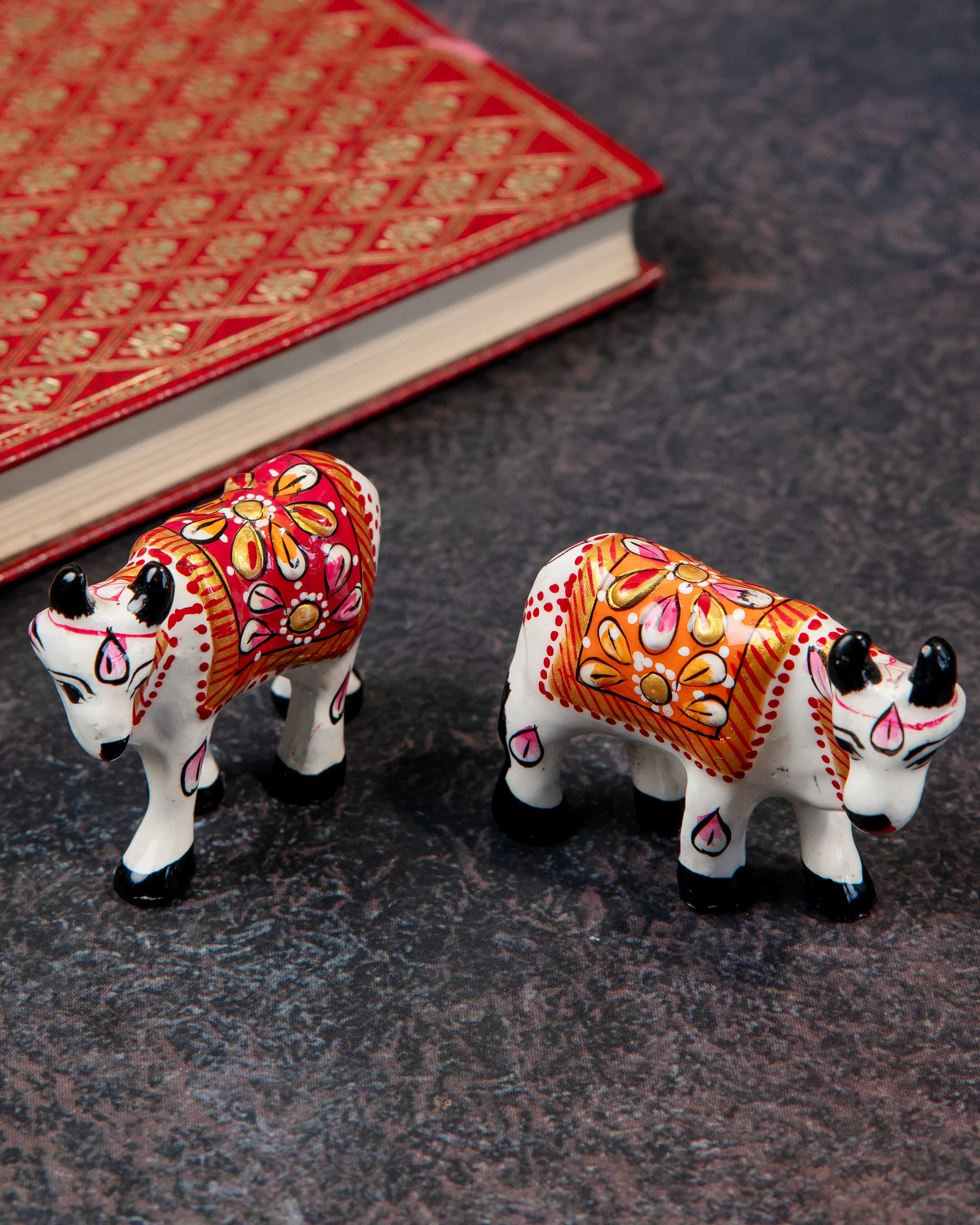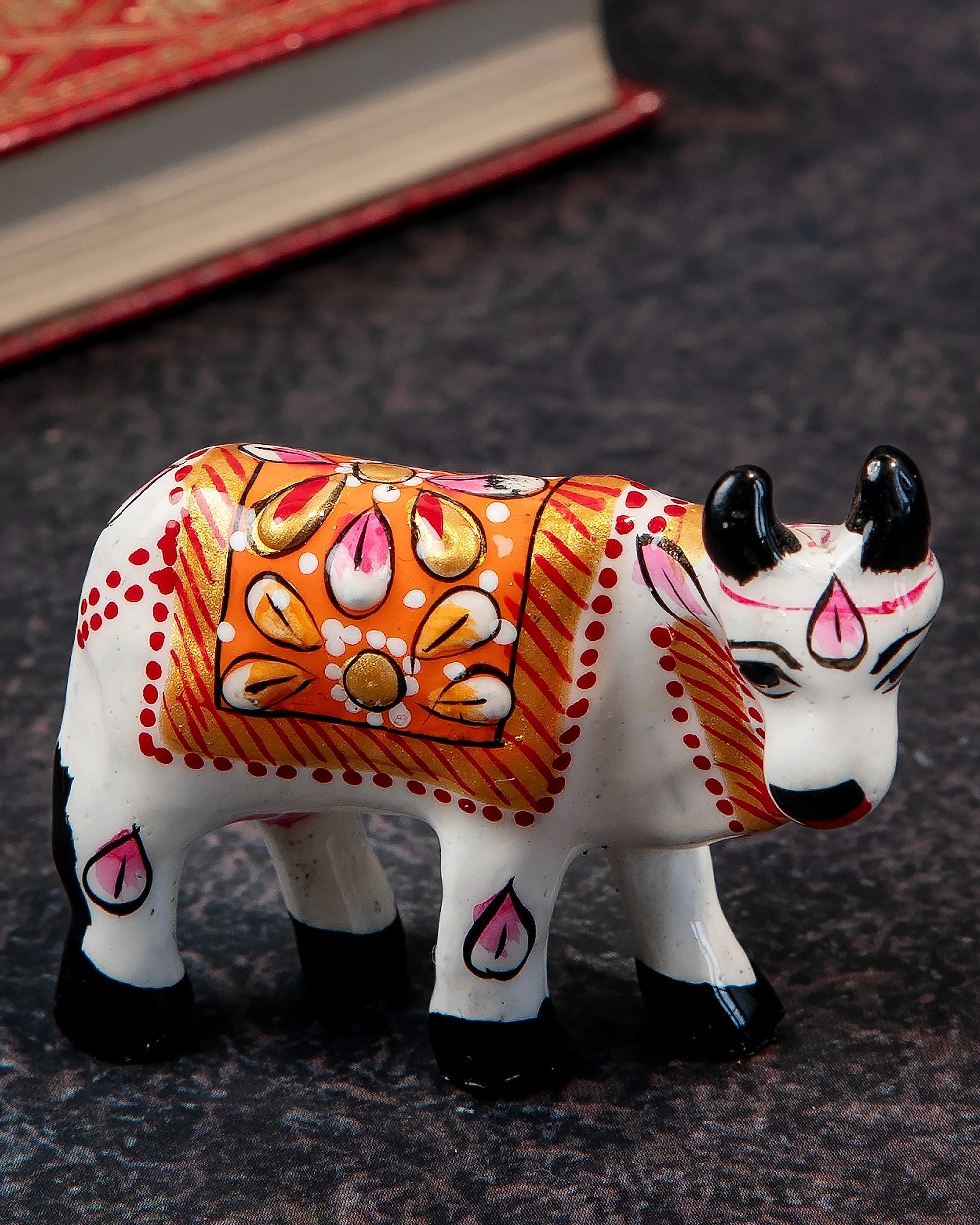 Hand-Painted Cow folk-art figurine crafted from fine metal and embellished with vivid enamel design. With its glossy finish and intricate Meenakari detailing, this artefact serves as a captivating décor accent or a meaningful gift—In Hindu Culture, the cow is the symbol of fertility, wealth, and selfless giving (often referred to as Kamadhenu or the wish-fulfilling cow)