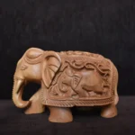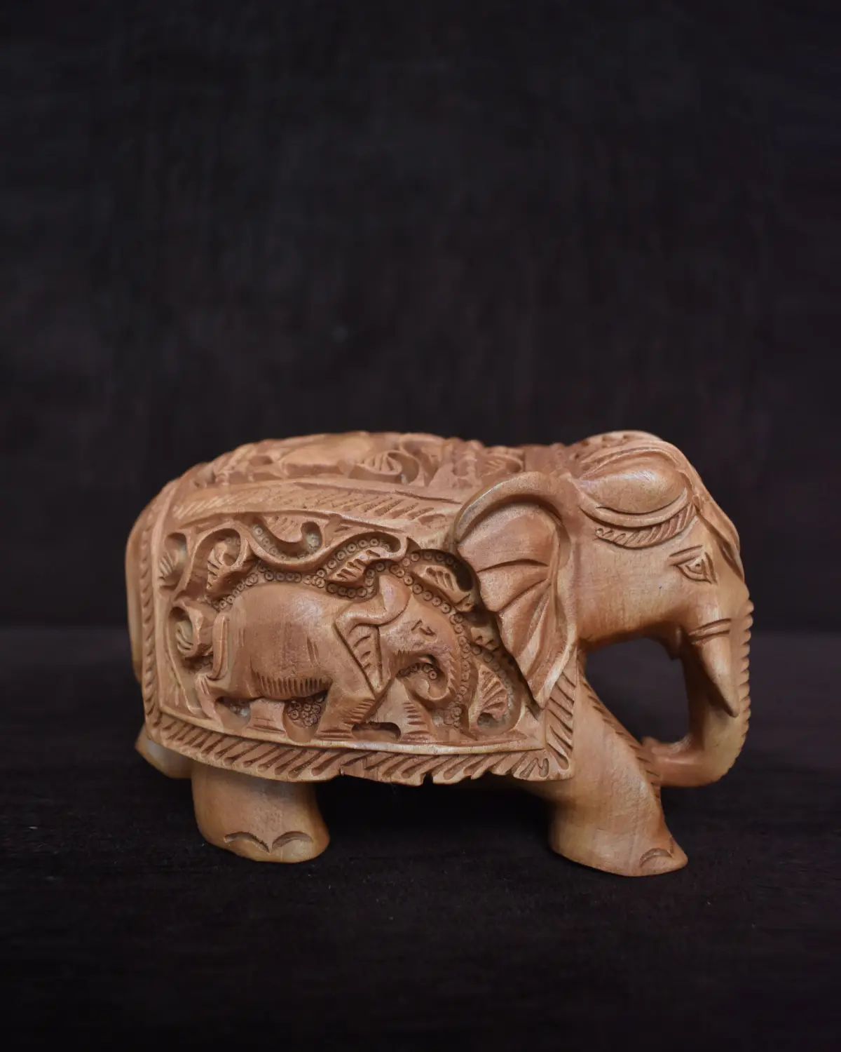 Finely hand‑carved wooden elephant. Shaped by skilled craftsmen, reflecting centuries of tradition and cultural symbolism. The elephant, revered as a symbol of wisdom, strength, and good fortune, is brought to life through intricate Meenakari detailing and natural wood textures. Perfect as a decorative accent, collectible, or thoughtful gift, this handicraft embodies the charm of Indian heritage while adding warmth and character to your home décor.