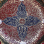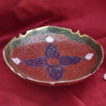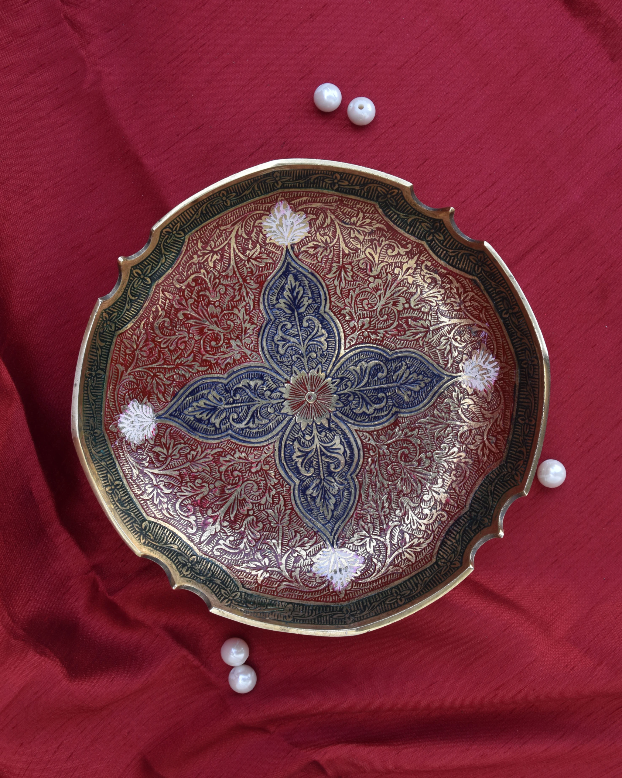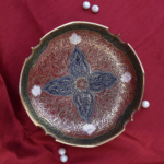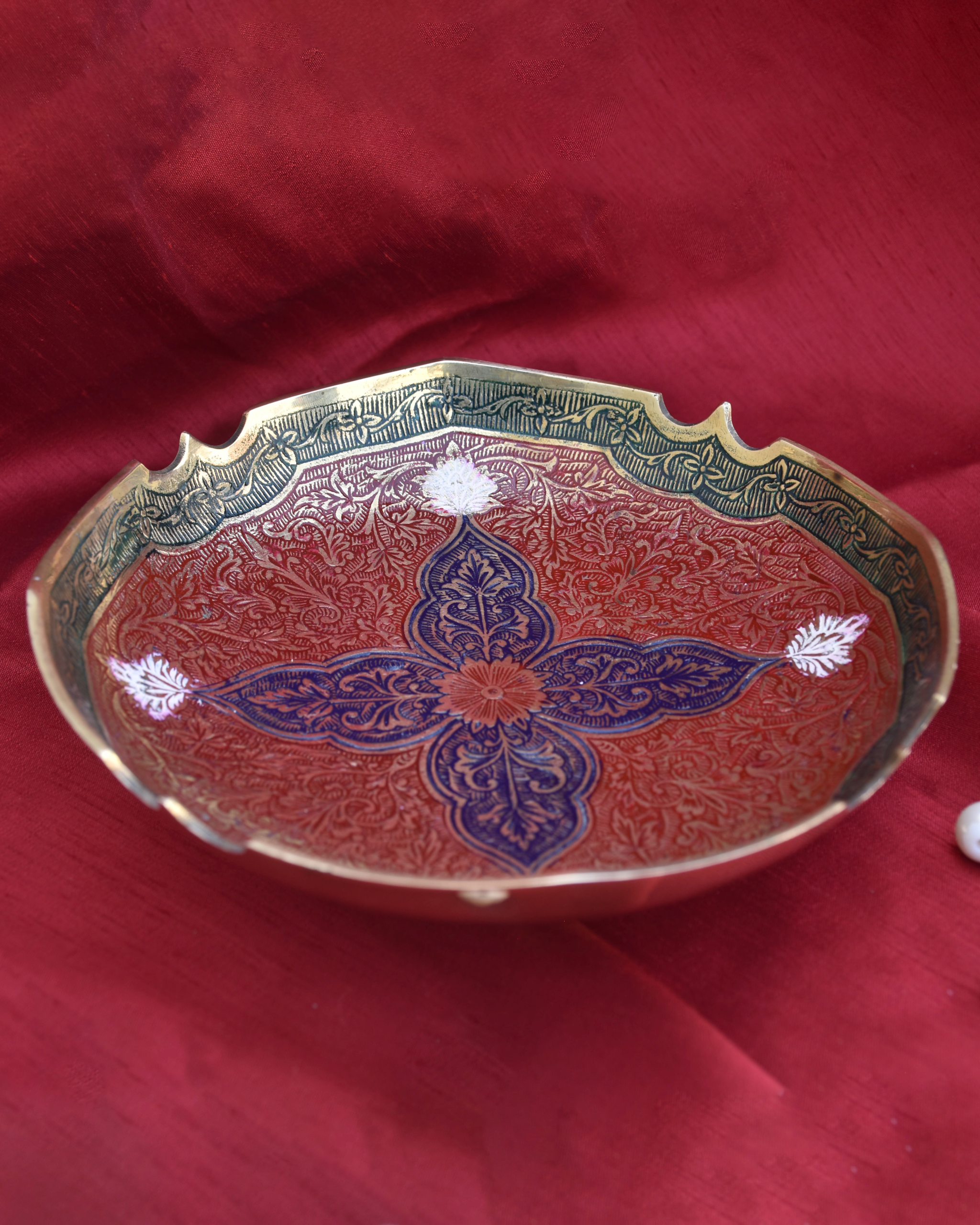 A bold and beautifully handcrafted brass bowl featuring rich red and blue tones, intricate carvings, and traditional motifs. Its round, heavy form and ornate detailing make it a striking centrepiece that reflects timeless artisan skill and cultural elegance.