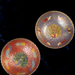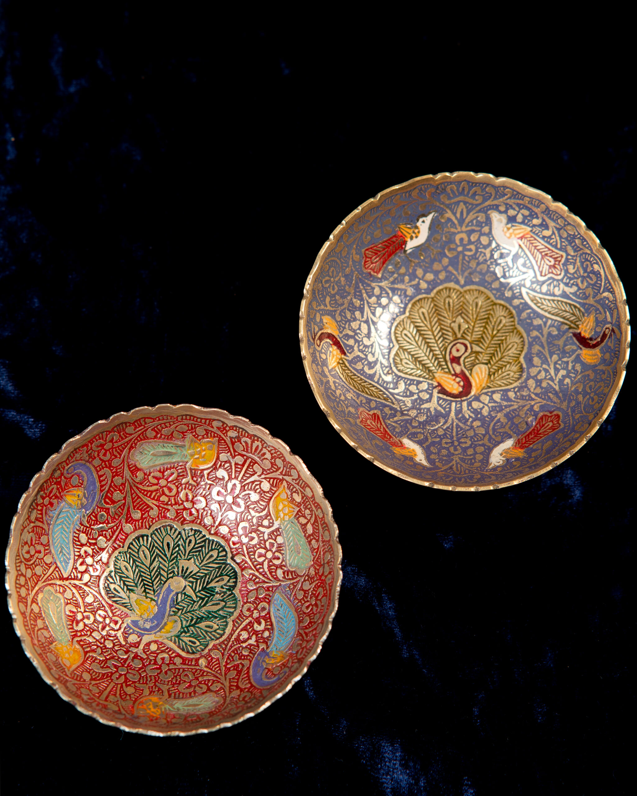 Elevate your space with this exquisite handcrafted decorative bowl, featuring a vibrant peacock at its centre surrounded by stylized birds and intricate golden floral patterns. Set against a rich blue background, the artwork showcases traditional craftsmanship with vivid hues of red, orange, and white. The scalloped metallic rim adds a touch of elegance, making it a stunning centrepiece or accent piece.